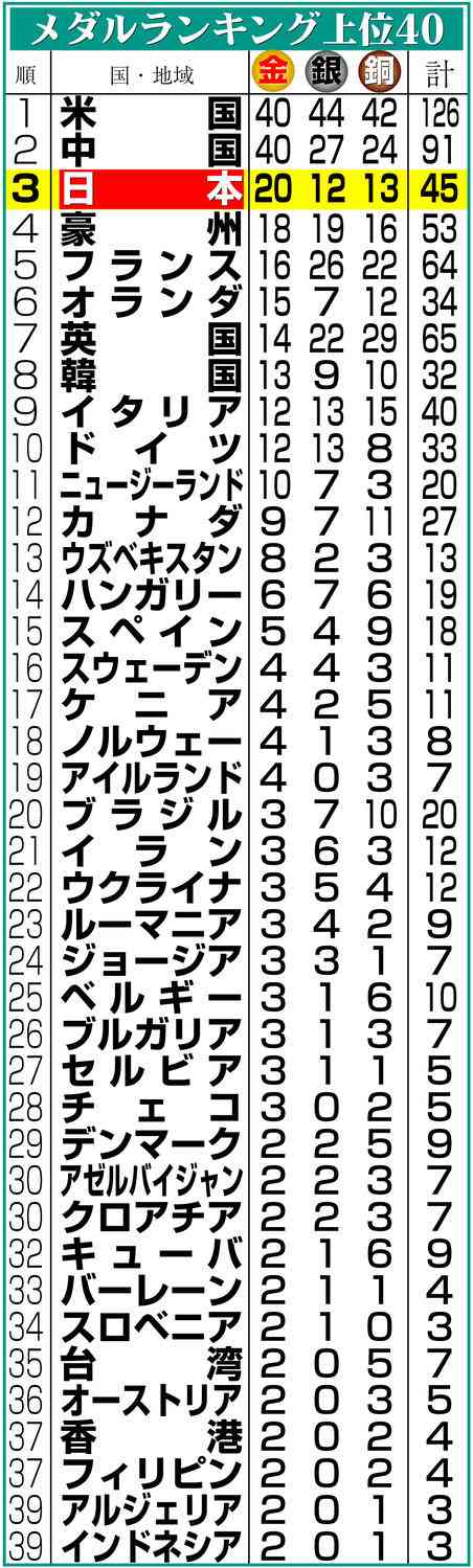 編集元: 【パリ五輪】全競技終了 日本のメダルは金20、銀12、銅13の計45個 チケット販売過去最多