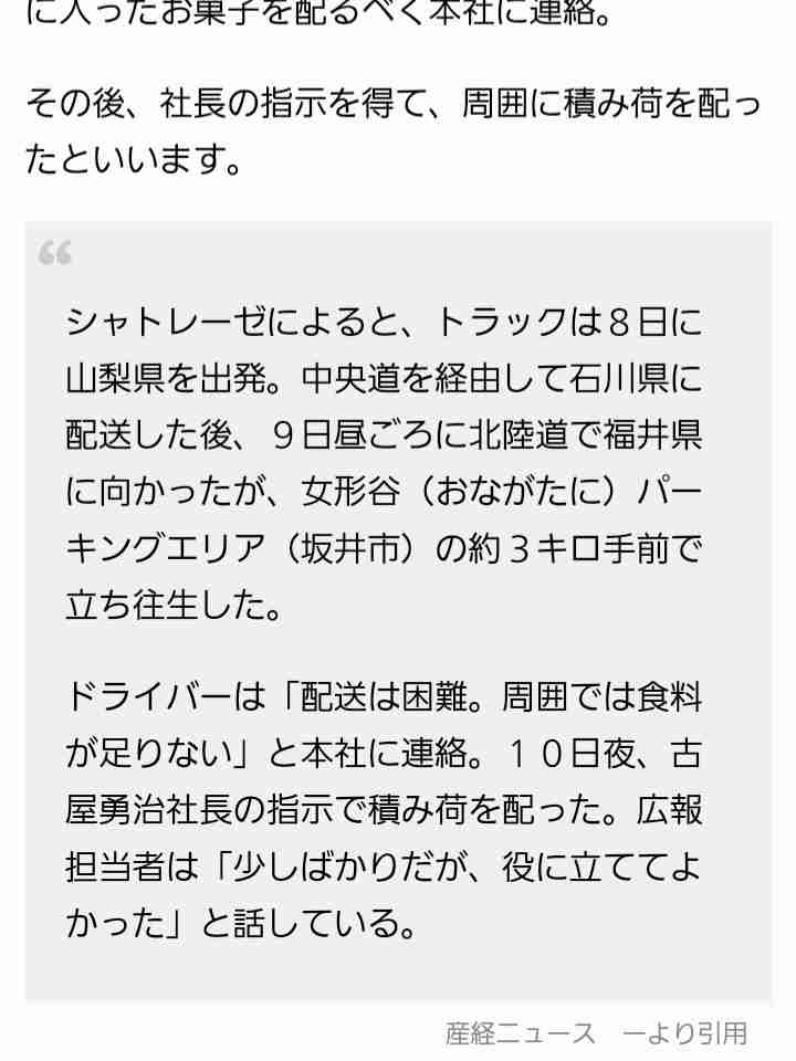 北陸道で大雪の為に立ち往生したとき、シャトレーゼさんも配ってくれたそう。