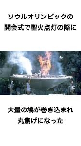 ソウルオリンピック。聖火点灯で鳩が燃えた