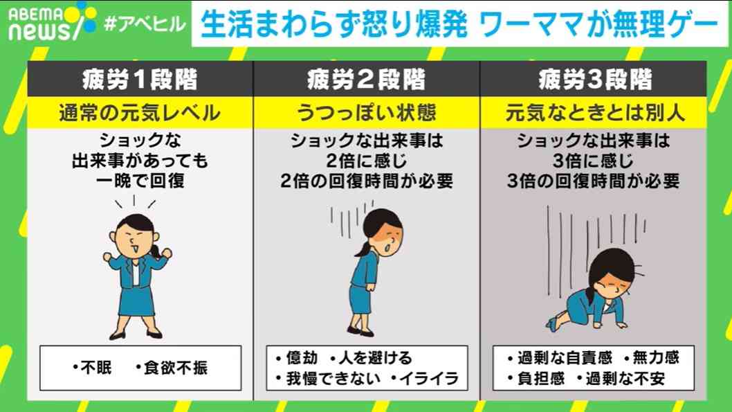 「仕事もでき、本人も元気だと思っていても、実はかなり疲れている。第2段階の時にまず出てくる症状がイライラだ。イライラし始めたら『疲れているんだ』と自覚してほしい」