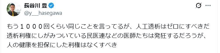 編集元: 長谷川豊氏、物議かもした人工透析めぐる主張再び「人の健康を担保にした利権はなくすべき」