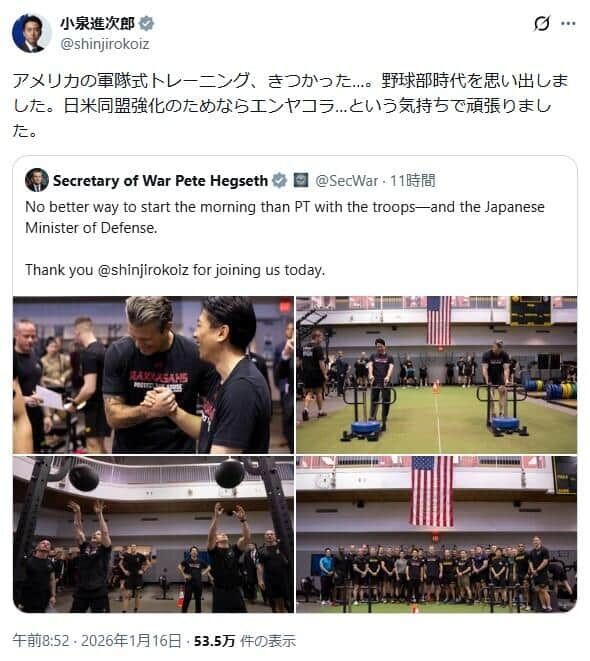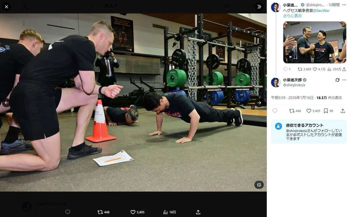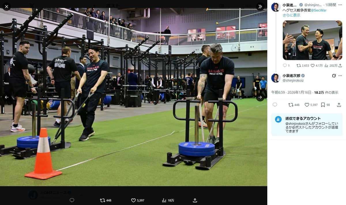 挑戦する進次郎もすごいけど、ヘグセス長官の腕と太ももすごいな……