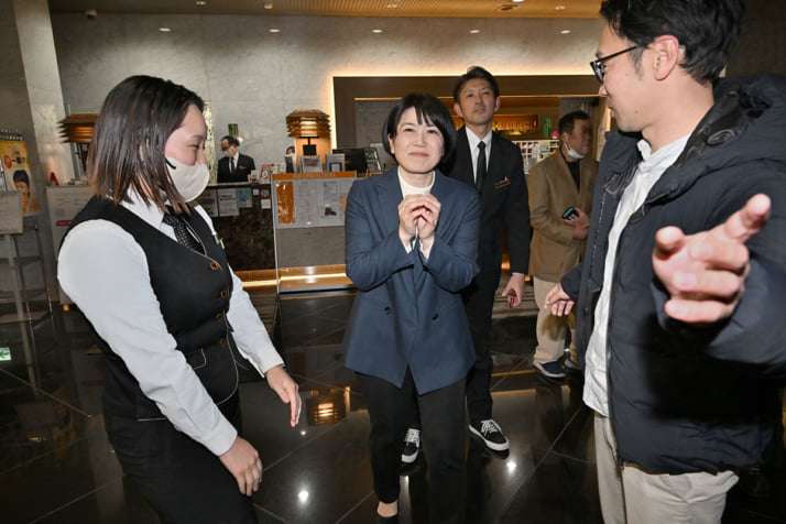 散会後には、ホテルの1階のフロントロビーで来場した支援者たちを自らお見送り。アイドルさながら支援者と熱い握手を交わしつつ、“ぶりっ子ポーズ”まで披露する大盤振る舞いだった。