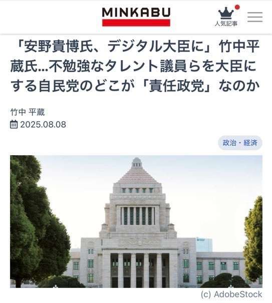 竹中平蔵、チームみらいの安野をデジタル大臣に猛プッシュしてたね