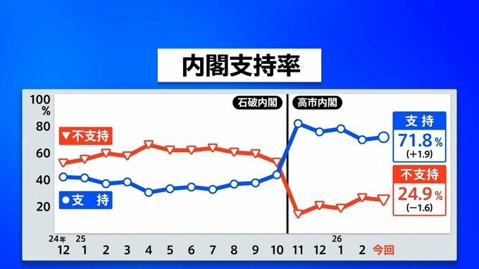 編集元: 高市内閣の支持率71.8% 前回から1.9ポイント上昇 JNN世論調査