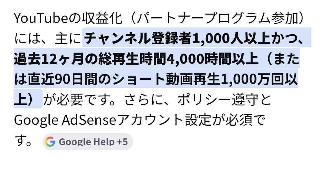 YouTubeの収益化本当にハードル高いです 自分もYouTube投稿してるんですが収益化条件が以下になり↓、登録者数1000人は達成出来てるものの再生時間か、再生数の条件が全く届いてないです。再生数で言うと、3ヶ月毎日動画を投稿してその全ての動画が再生数12万を超えるのが最低ラインなので、私はあわよくばと思っていましたが収益化は諦めて元々趣味を動画にしてる投稿なので記録用に細々と投稿しています。一番多く見られたショート動画が100万超えてますが平均再生回数1万位です